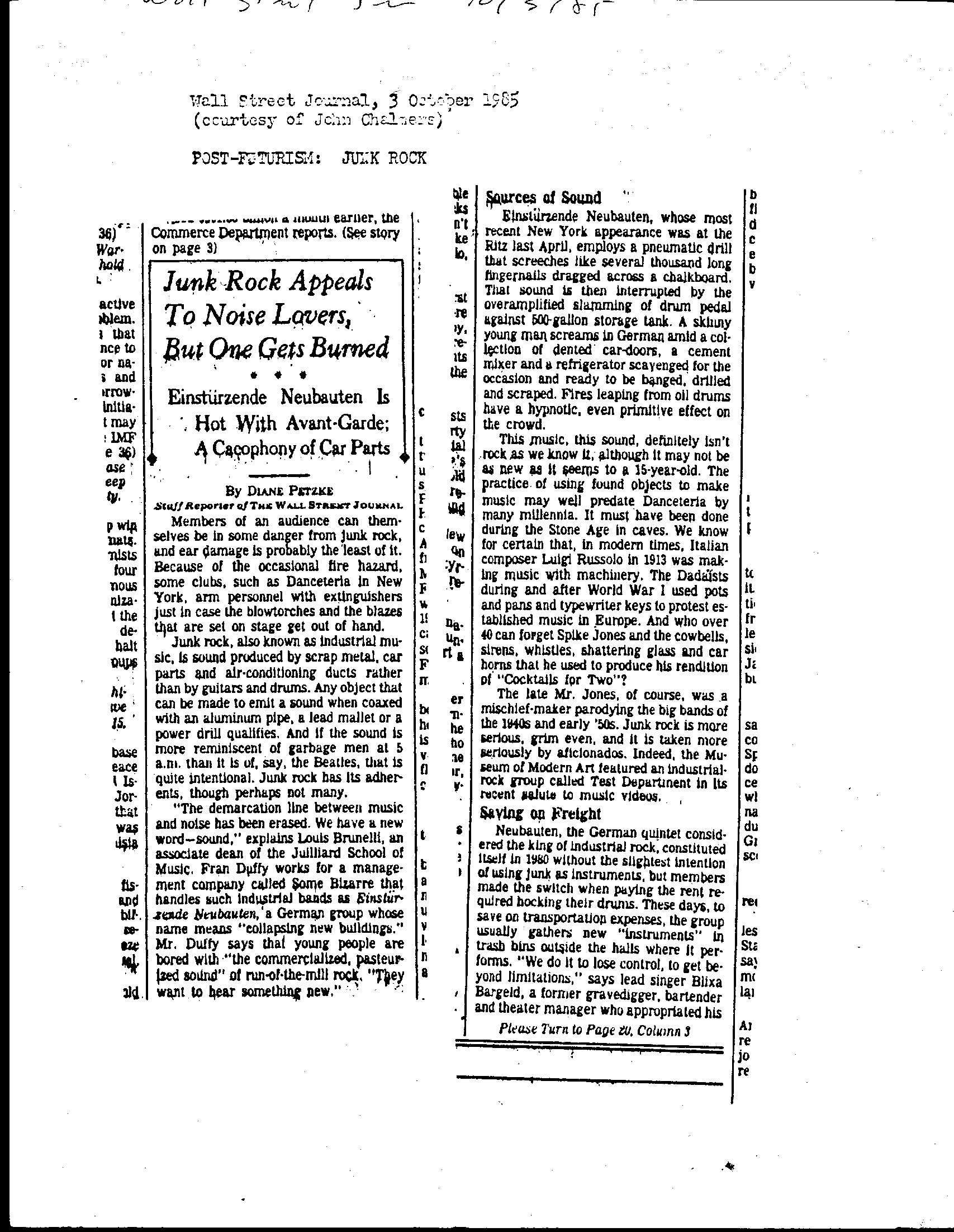 Diane Perzke. ‘Post-Futurism: Junk Rock.’ Wall Street Journal, October 3, 1985.