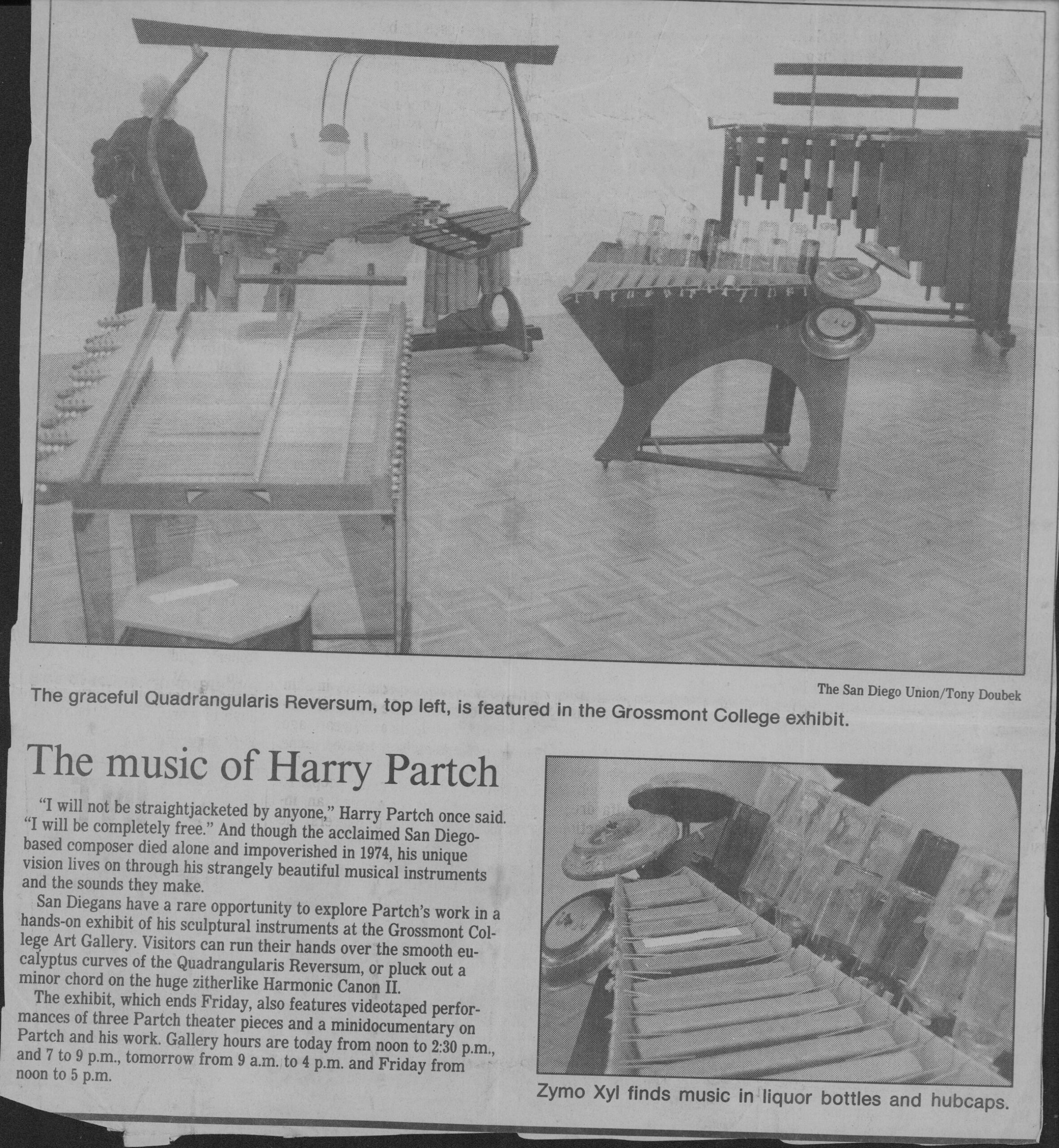 Newspaper article on Harry Partch’s works and exhibition at Grossmont College, comparing his compositional approach to Western orchestral tradition. San Diego Reader, date unknown.