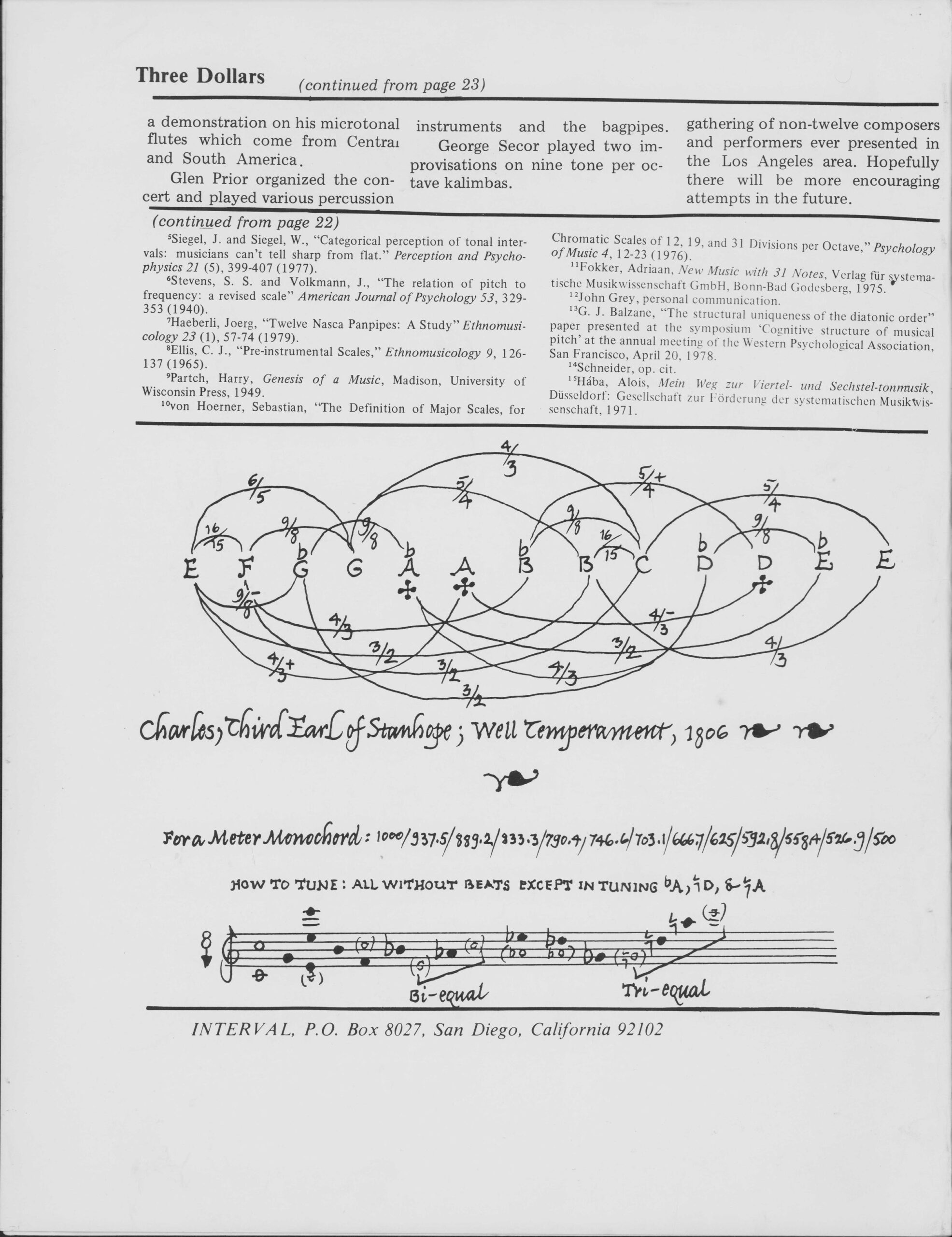 Concert review and tuning documentation. Brand Library Concert featuring Ivor Darreg and Erv Wilson. Interval Magazine Vol. II No. 2-3, featuring Lou Harrison’s well temperament tuning chart.