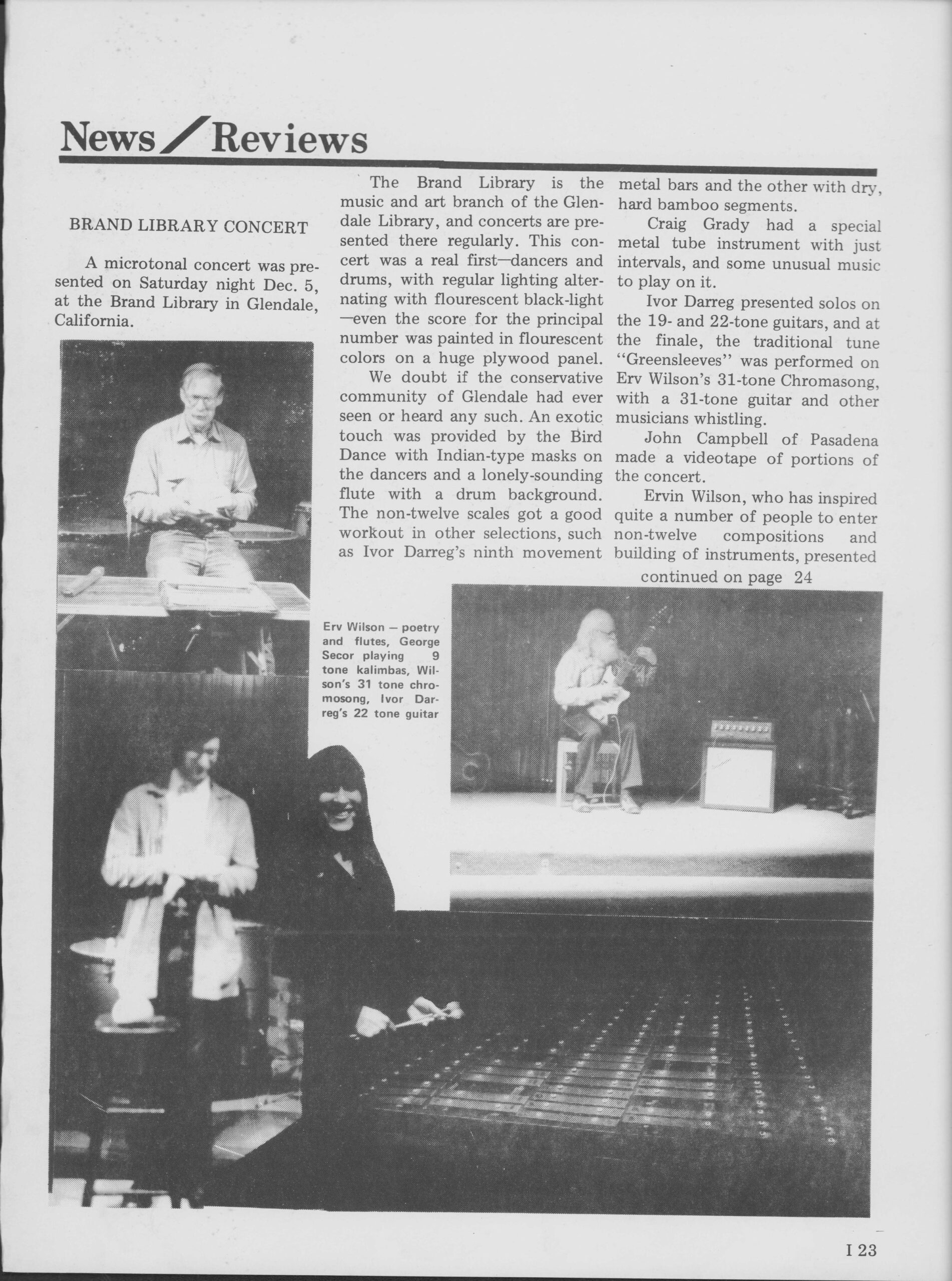 Brand Library Concert review. Interval Magazine, Vol. II, No. 2–3. December 5, featuring Ivor Darreg on 19- and 22-tone guitars and Erv Wilson’s 31-tone Chromasong.