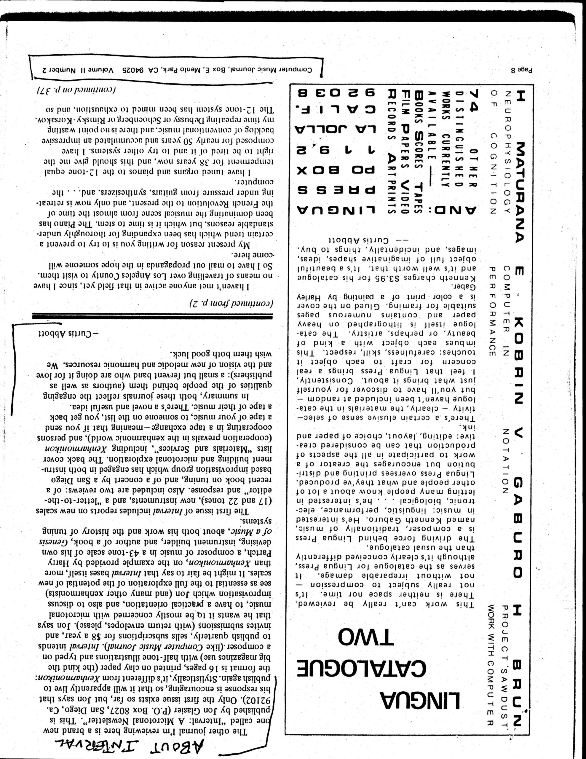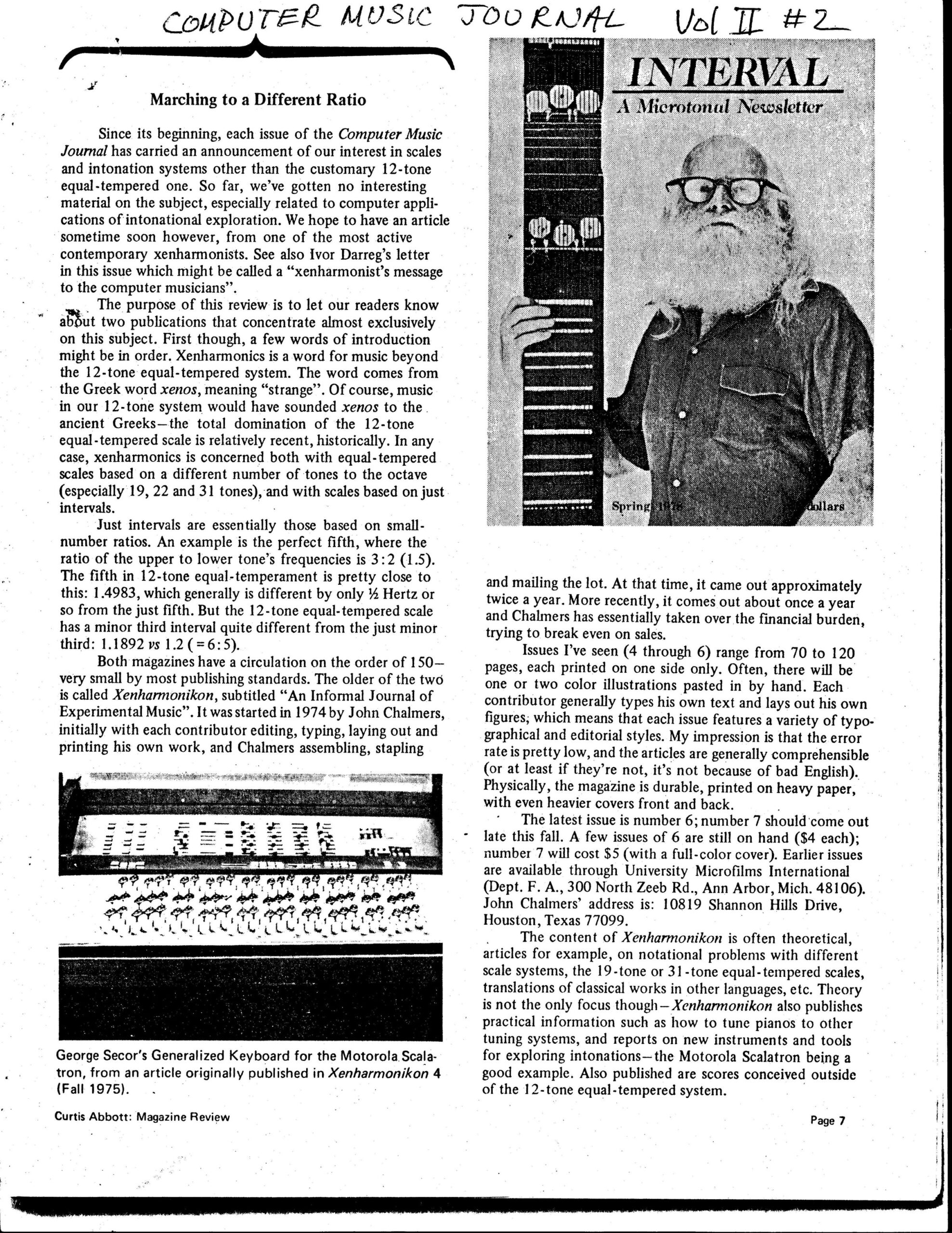“Marching to a Different Ratio.” Computer Music Journal, Vol. II No. 2, pages 7–8. Review of xenharmonic publications Xenharmonikon and Interval, with discussion of just intonation and alternative tuning systems.