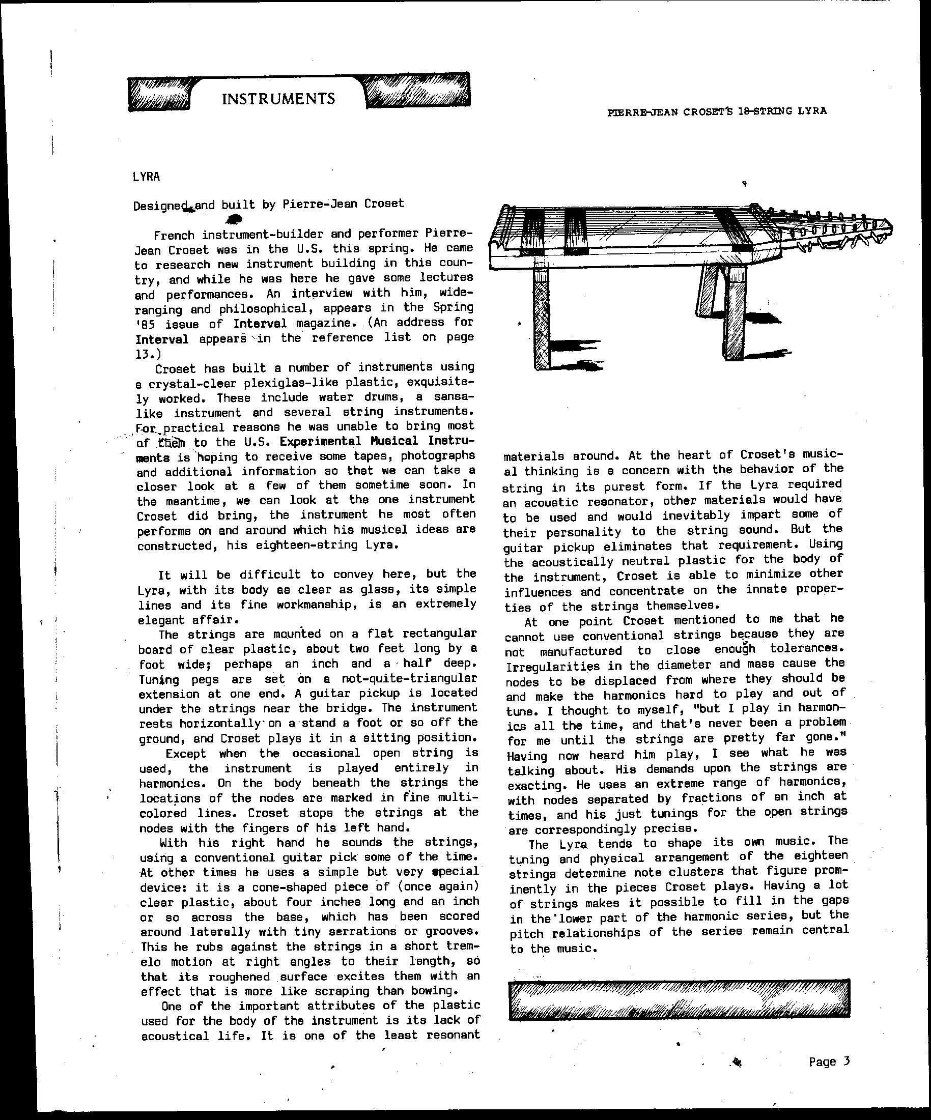 Pierre-Jean Croset. Lyra (eighteen-string instrument with clear plexiglas body). Experimental Musical Instruments magazine, Spring 1985.
