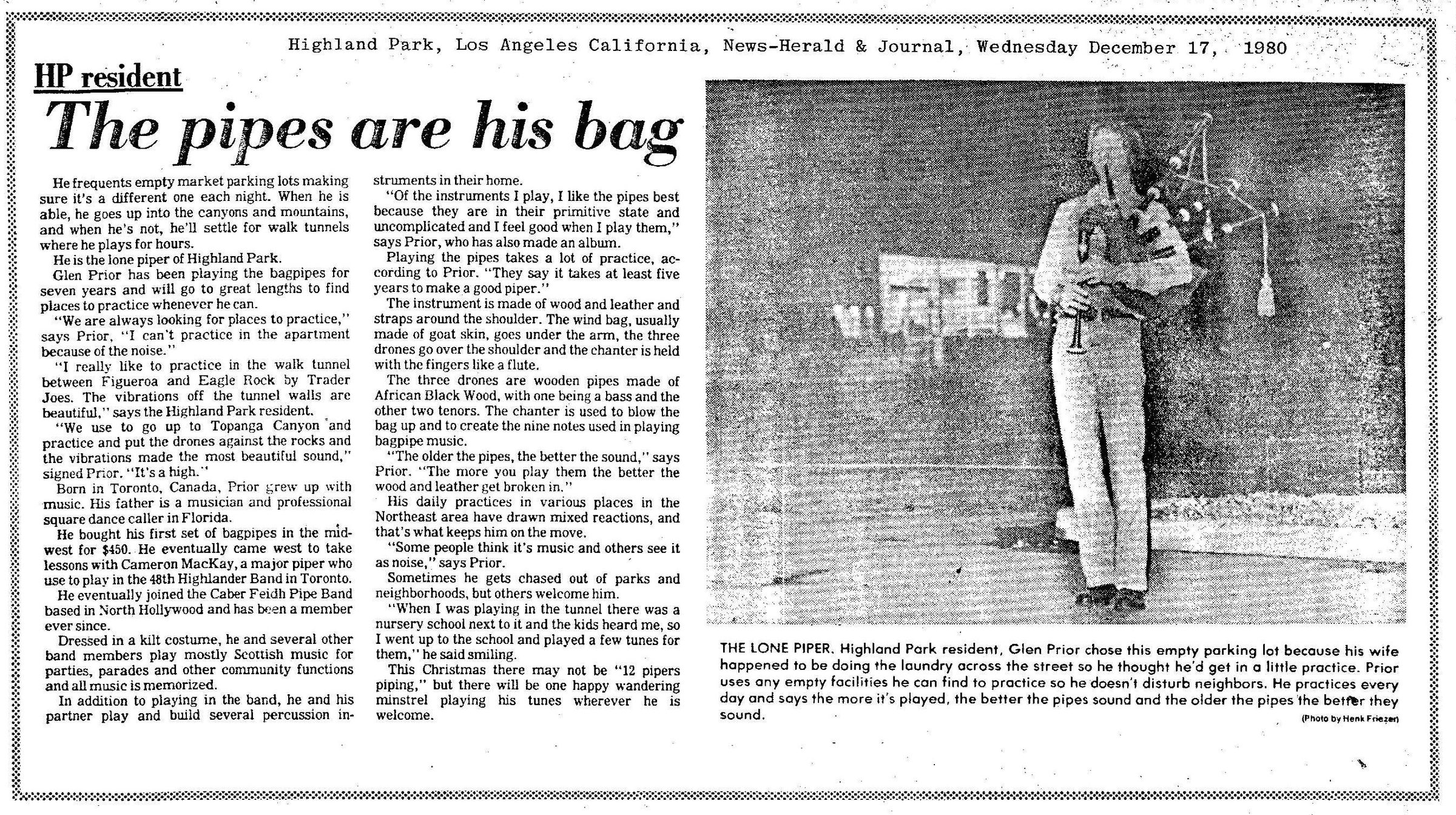 News Herald and Journal. ‘Glen Prior: The Lone Piper of Highland Park.’ December 17, 1980.