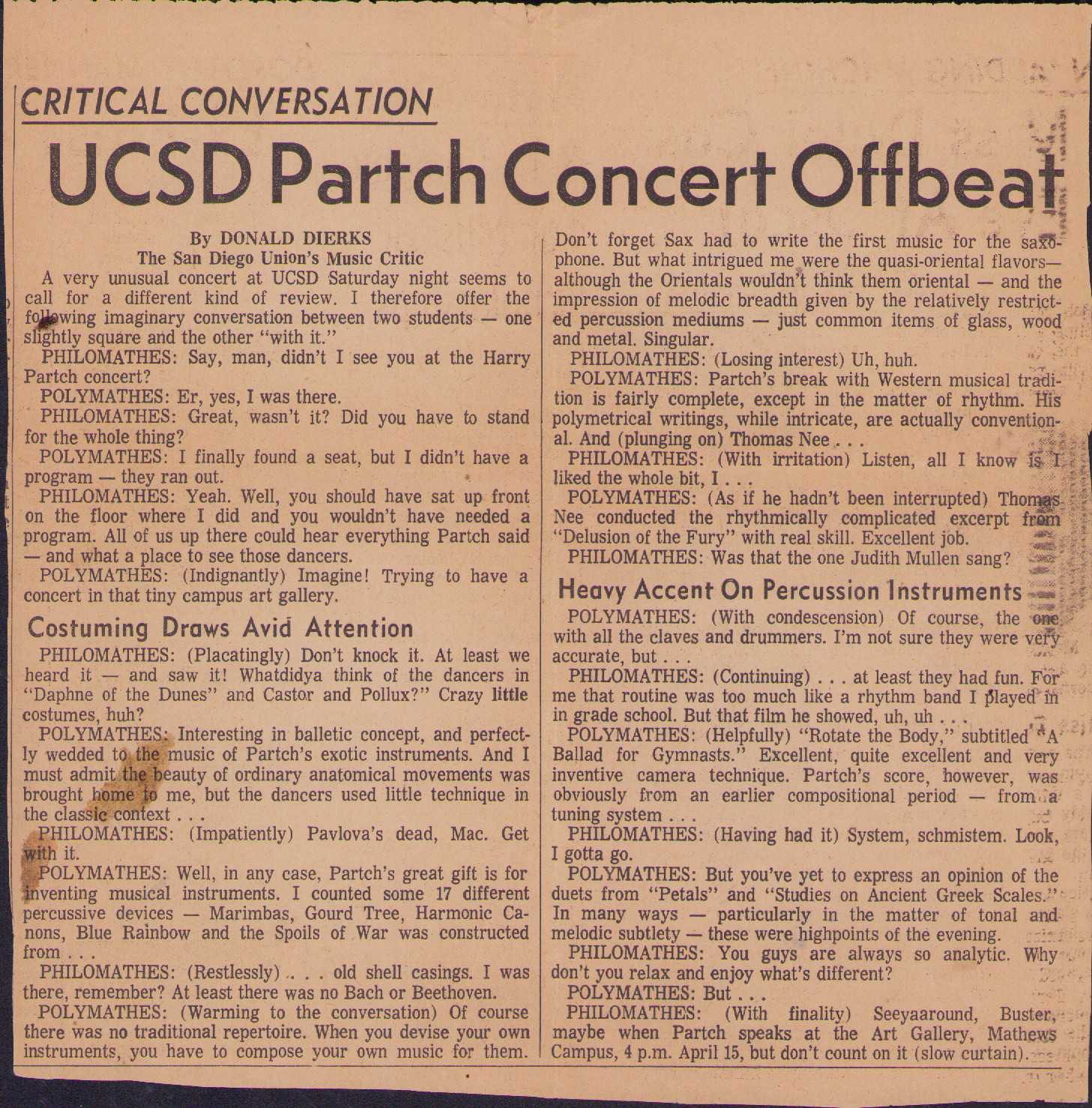 Donald Dierks. ‘UCSD Partch Concert Offbeat.’ The San Diego Union, date unknown.