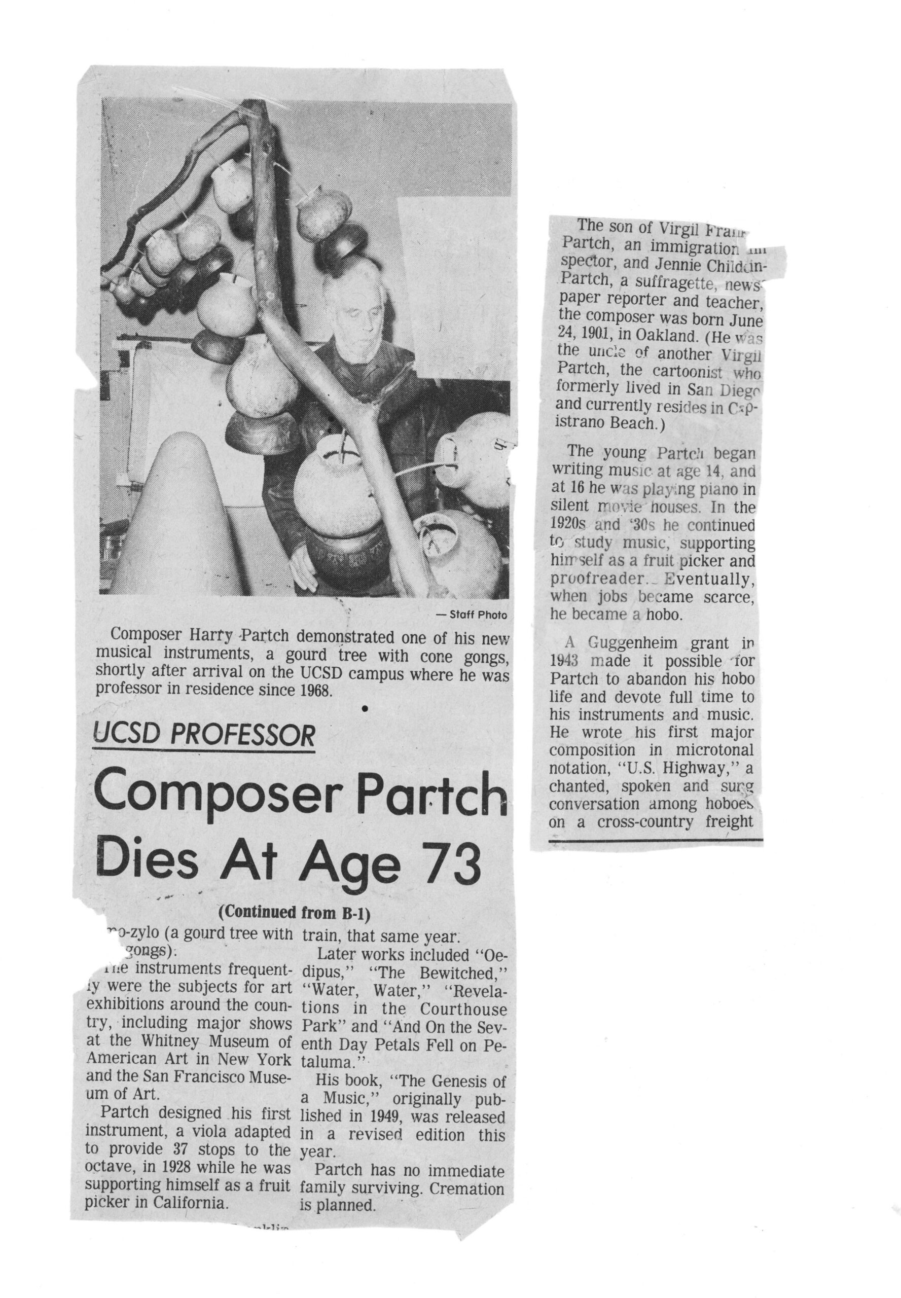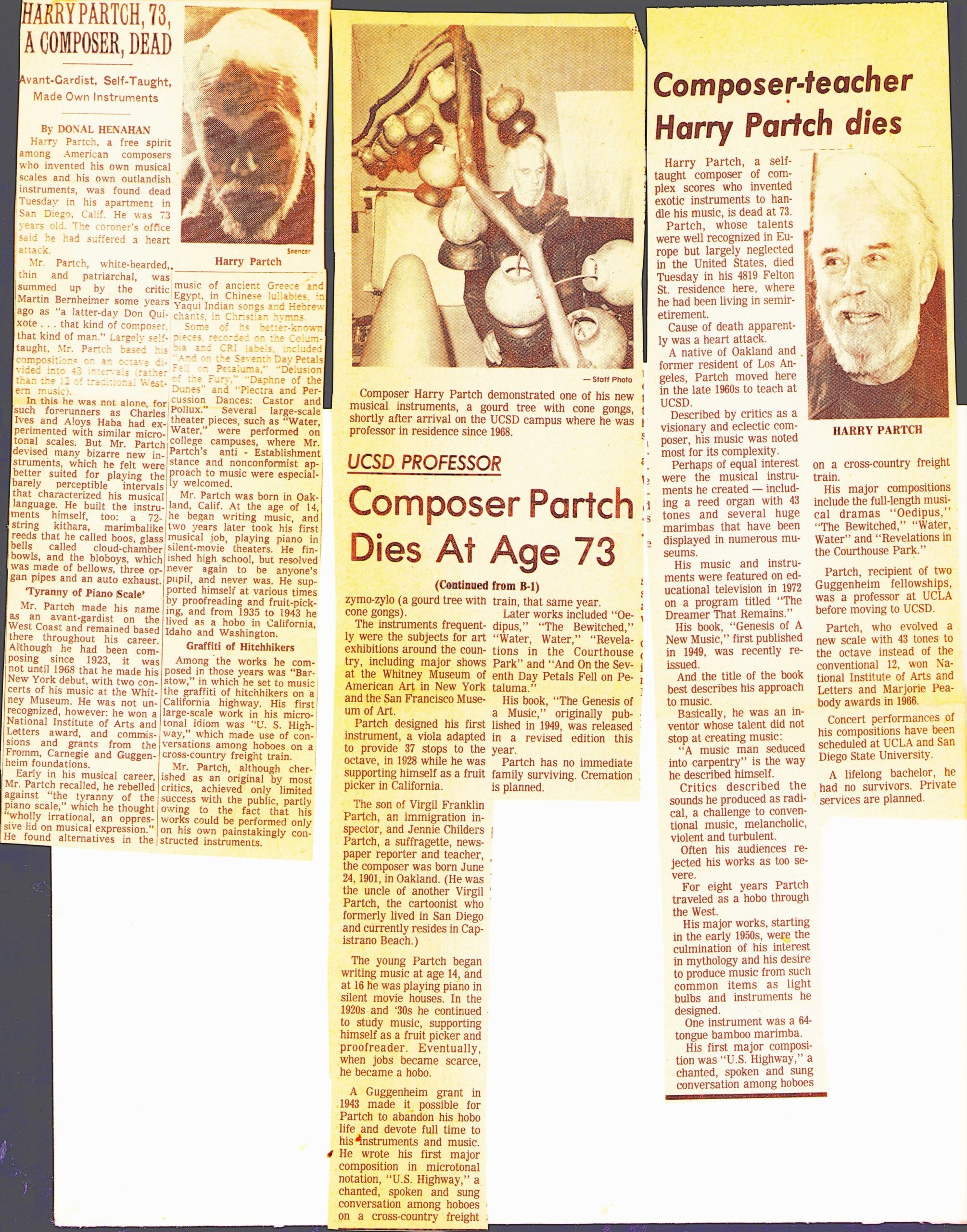 San Diego Union. ‘UCSD Professor Composer Partch Dies At Age 73.’ September 1974.
