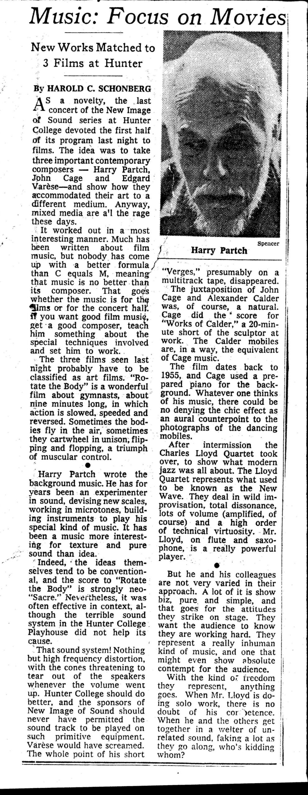 Harold C. Schonberg. Review of films by Harry Partch, Edgard Varèse, and John Cage at Hunter College. 1968.