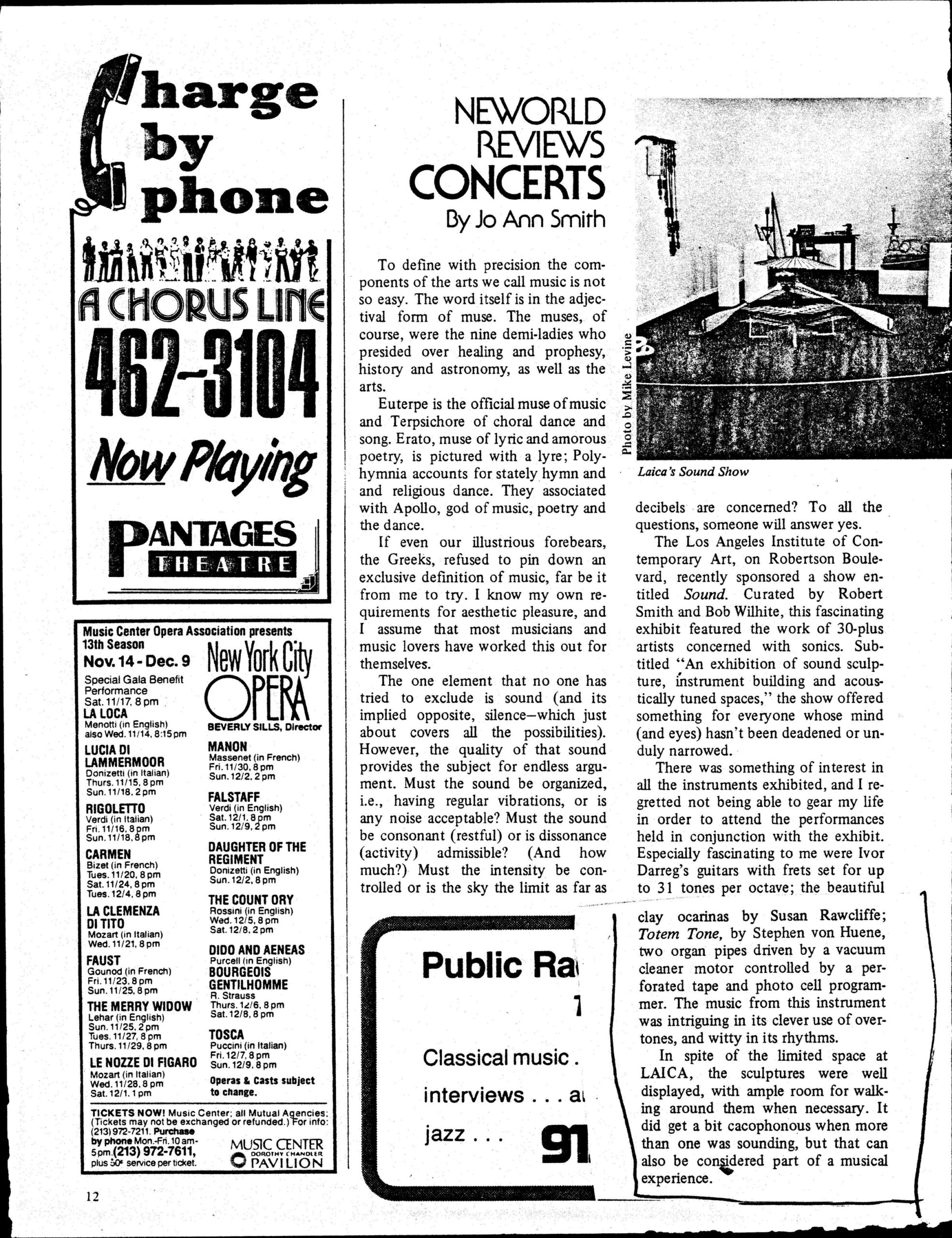 Jo Ann Smith. ‘New World Concerts.’ Review of the ‘Sound’ exhibit at Los Angeles Institute of Contemporary Art, 1981.