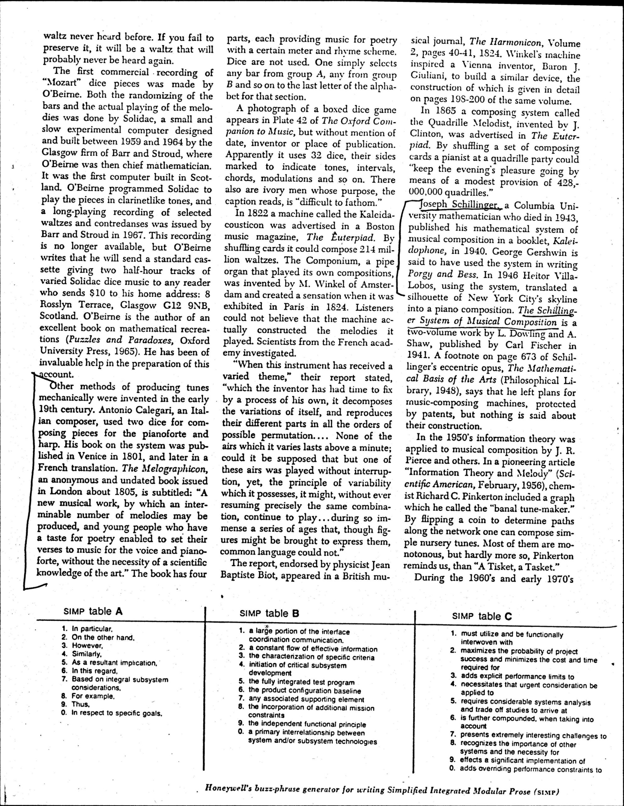 Music composition as a game. Article discussing dice-based composition methods and computer-generated music.