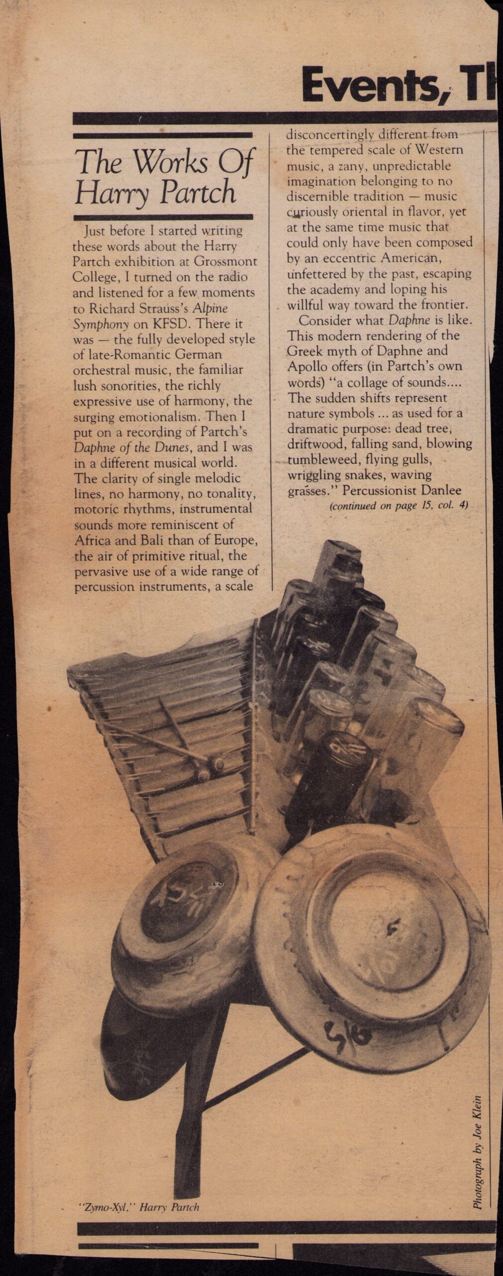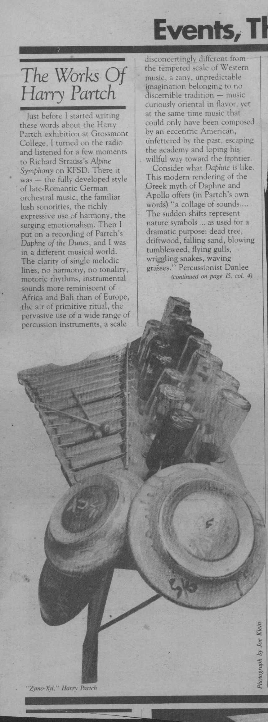 Unknown author. ‘The Works of Harry Partch.’ San Diego Reader, date unknown. Photograph by Joe Klein.