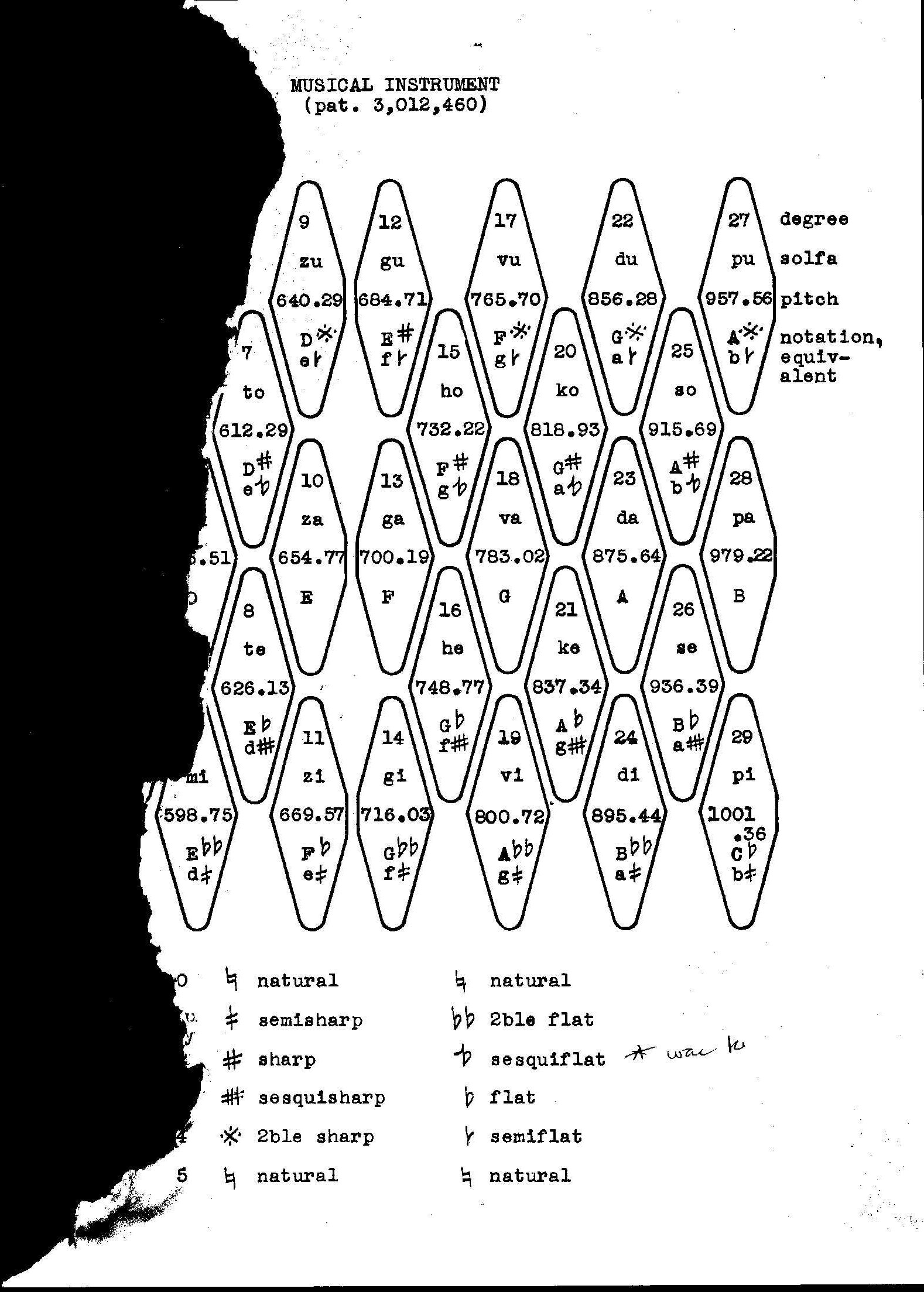 Patent (image partially destroyed) for a Musical Instrument by Erv Wilson. Part of a series of letters from Erv Wilson to Ivor Darreg. Erv Wilson, 1962-01-01