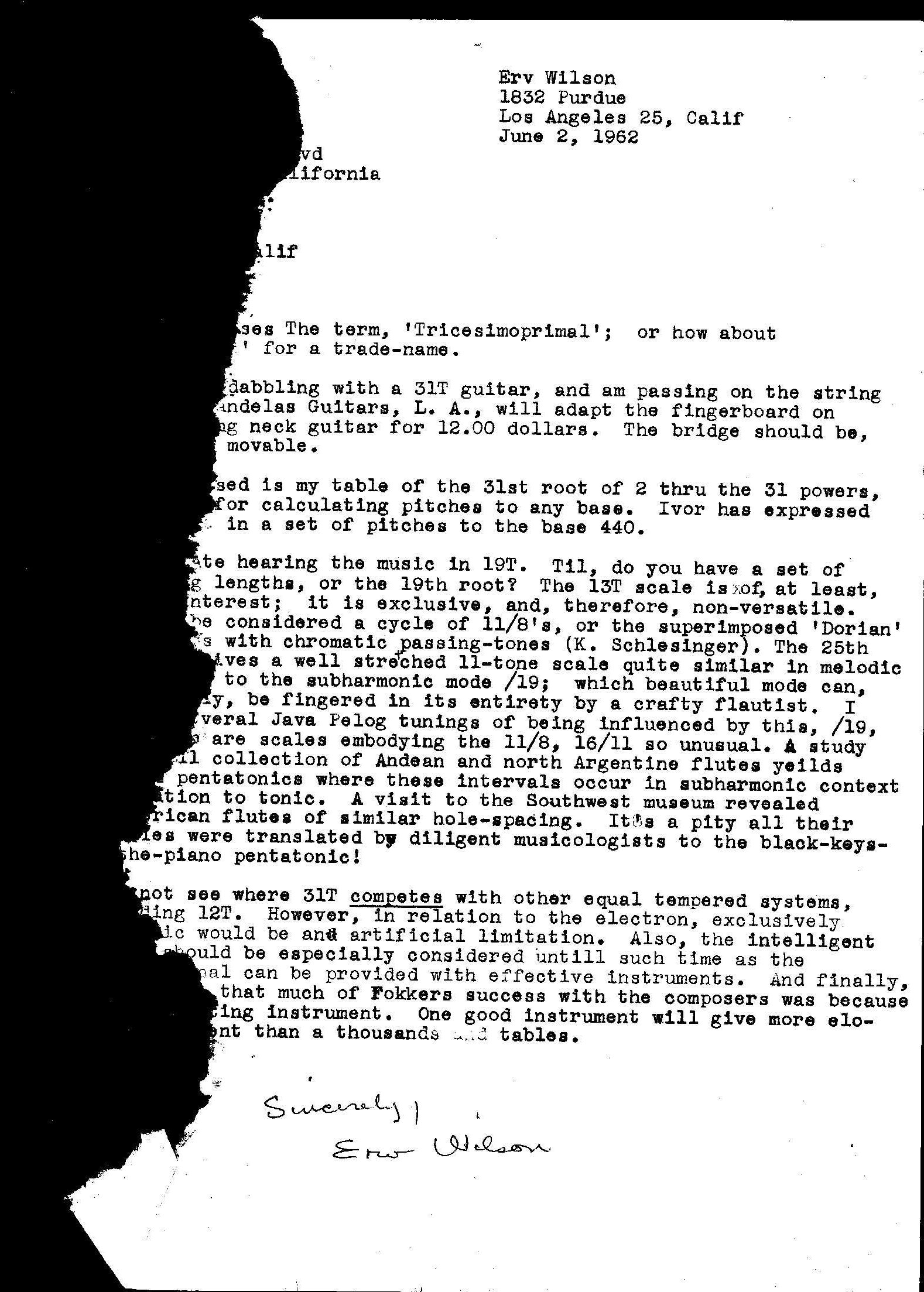 Letter from Erv Wilson to Ivor Darreg. Erv Wilson, 1962-06-02