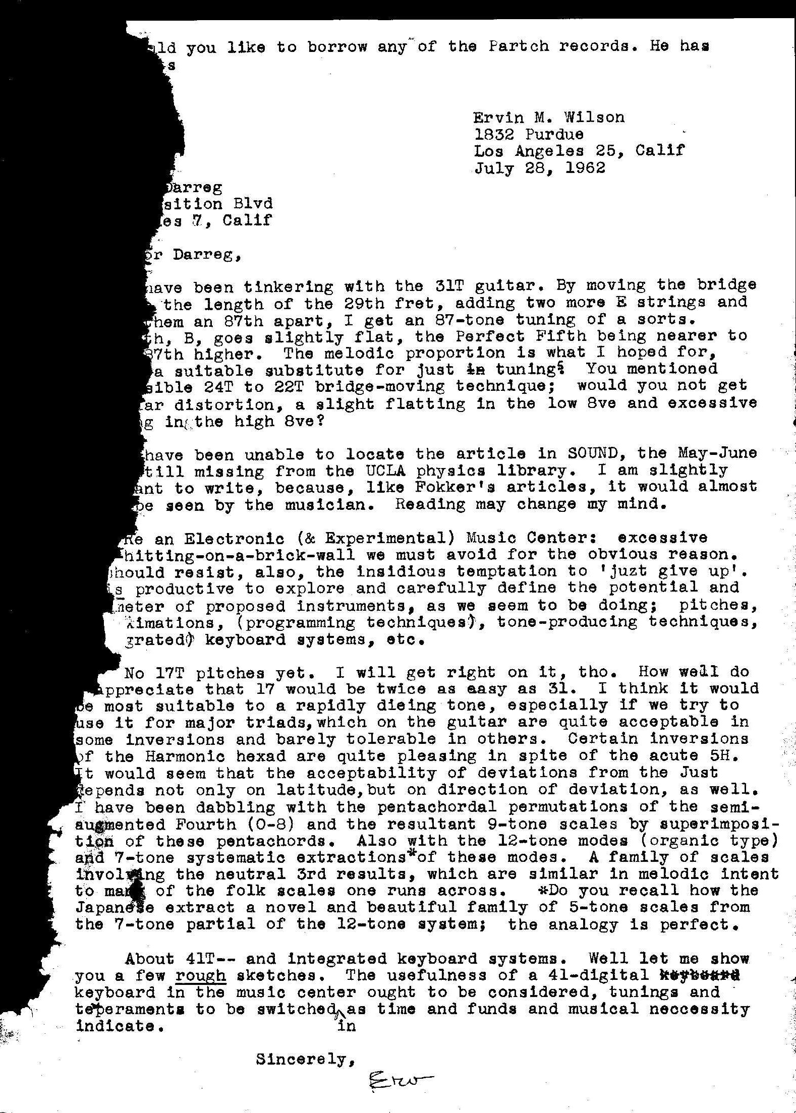 Letter from Erv Wilson to Ivor Darreg. Erv Wilson, 1962-07-28