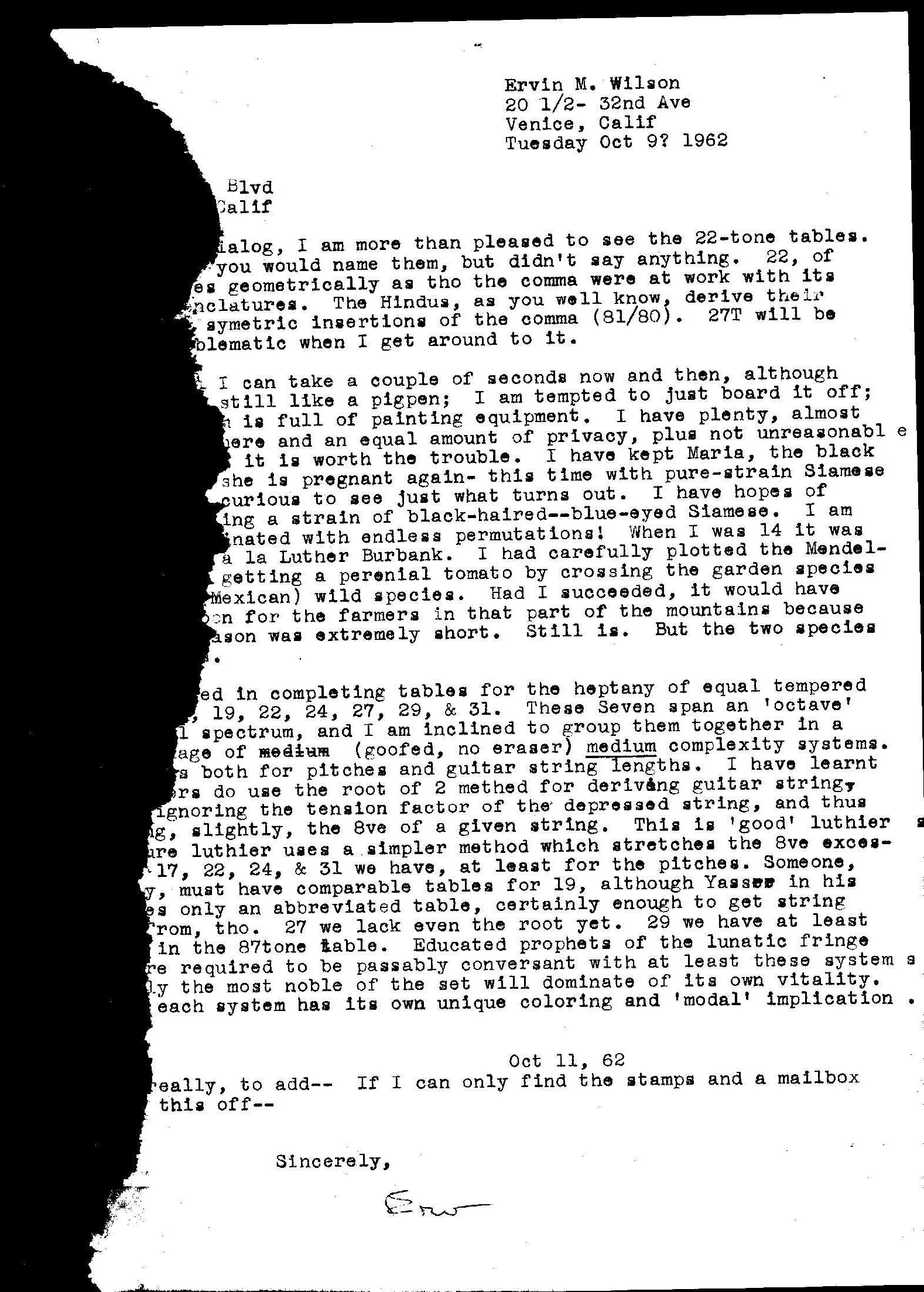 Letter from Erv Wilson to Ivor Darreg. Erv Wilson, 1962-10-09