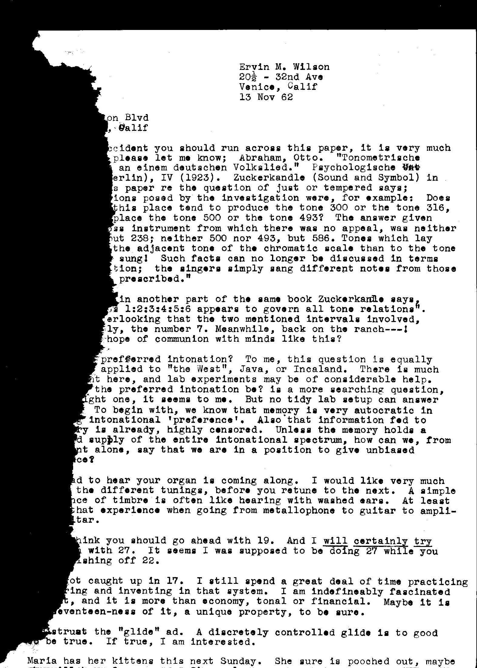 Letter from Erv Wilson to Ivor Darreg. Erv Wilson, 1962-11-13