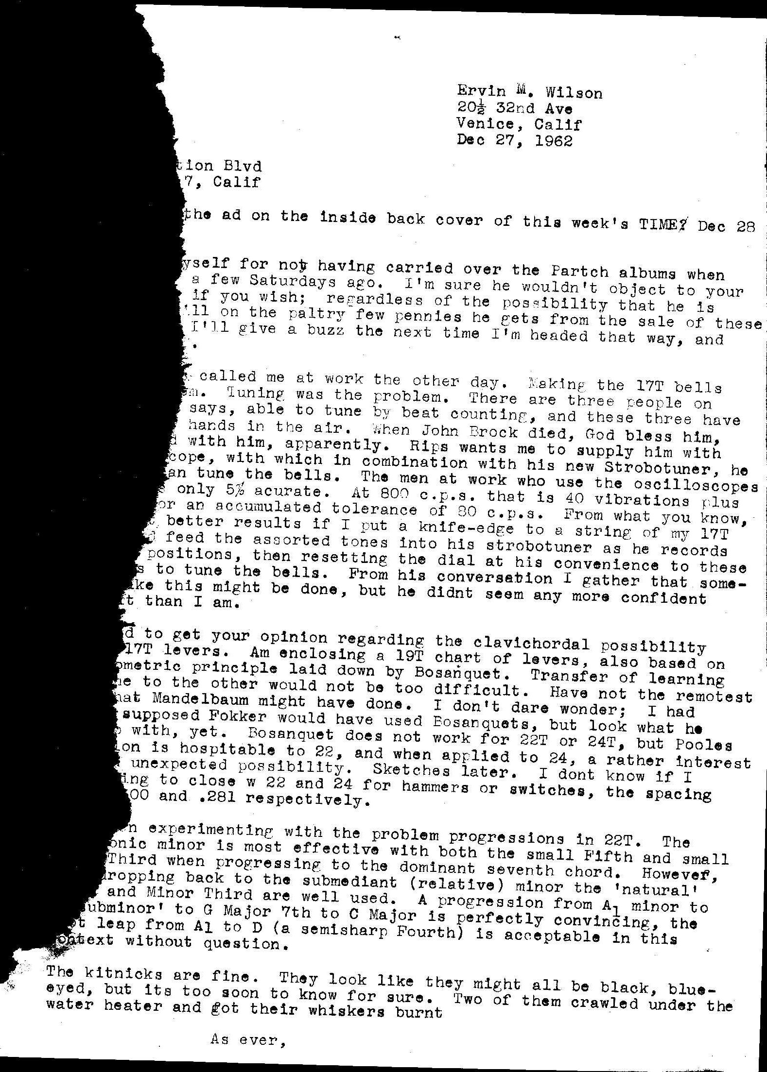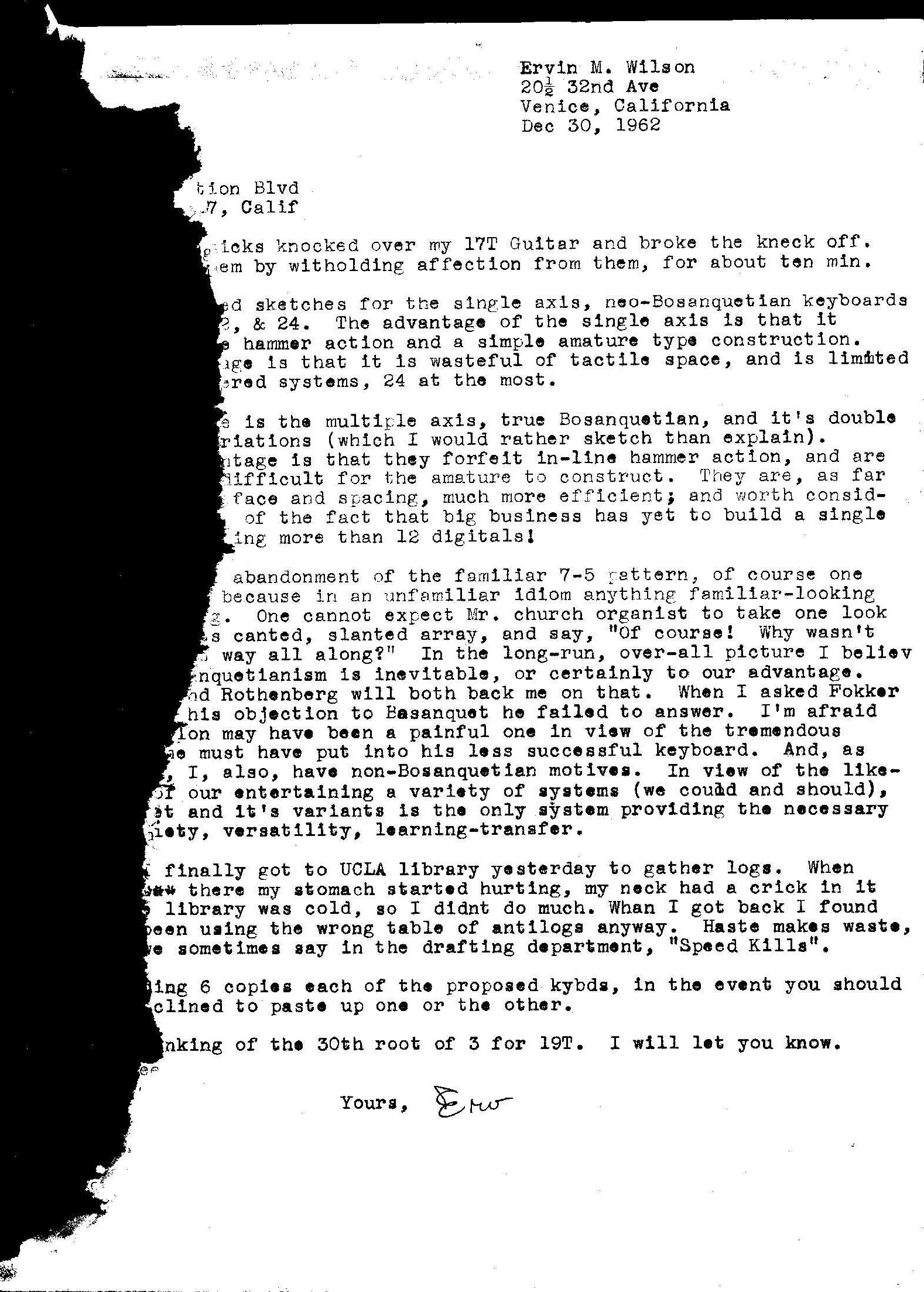 Letter from Erv Wilson to Ivor Darreg. Erv Wilson, 1962-12-30