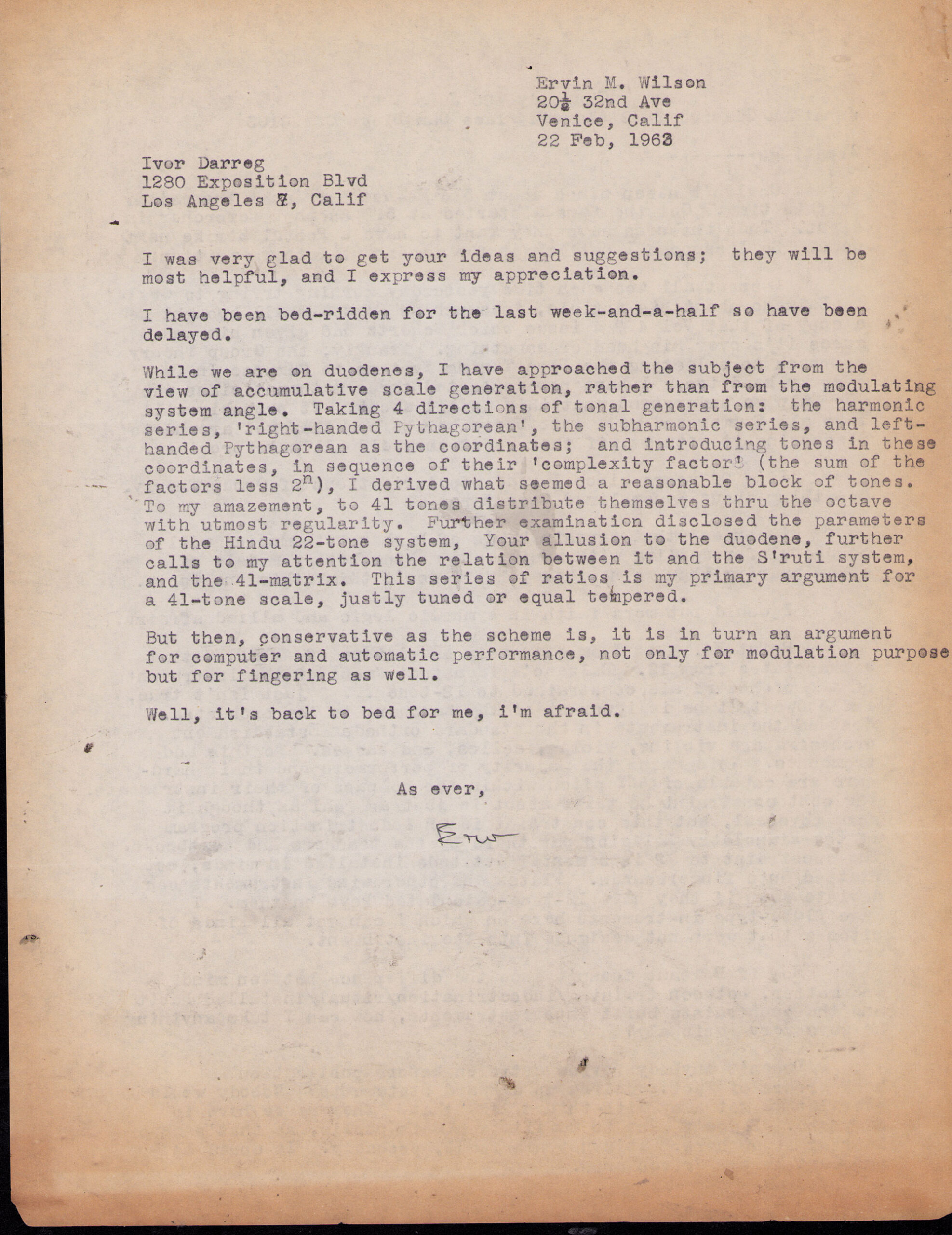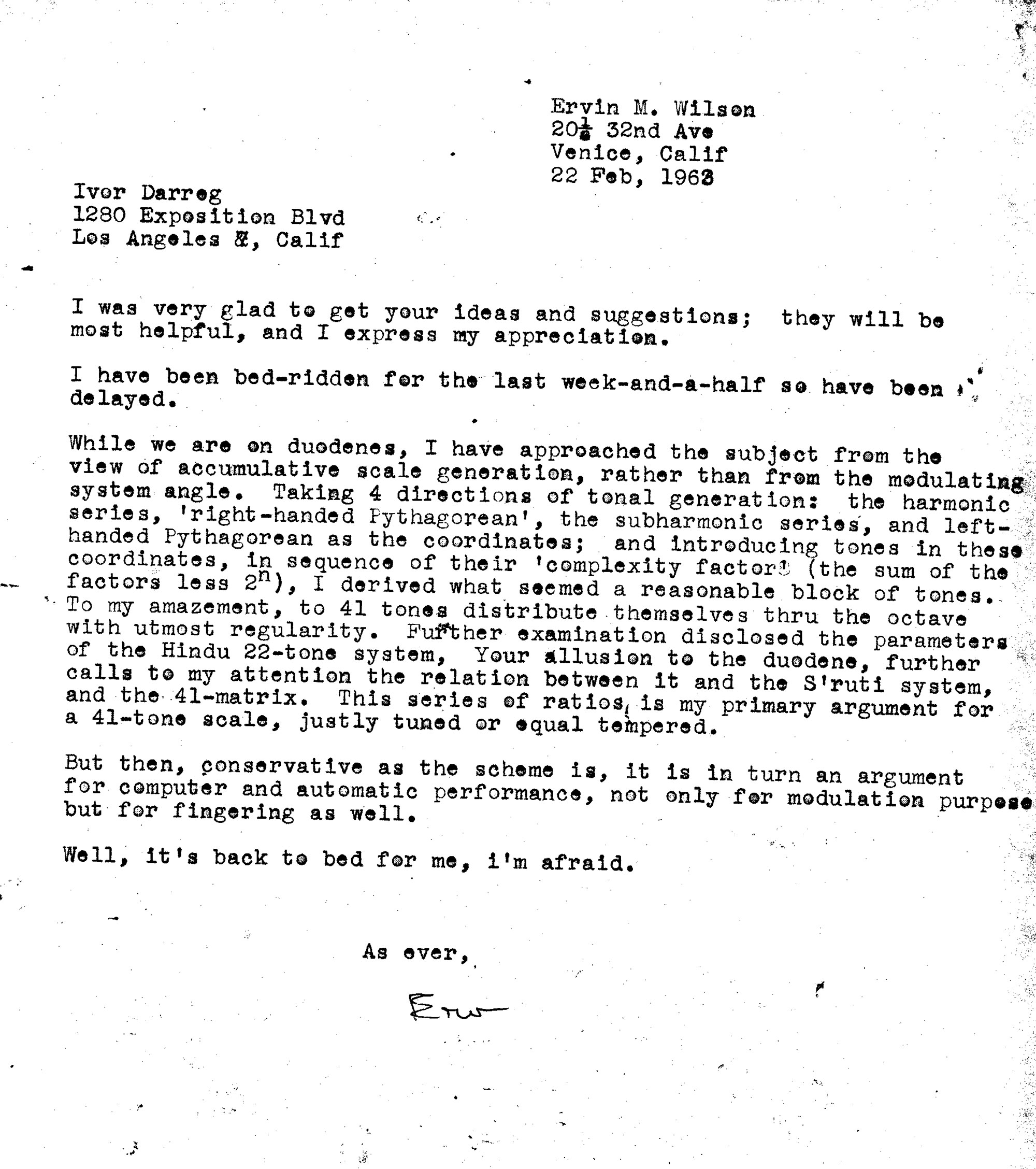 Letter from Ivor Darreg to Erv Wilson. Ivor Darreg, 1963-02-22