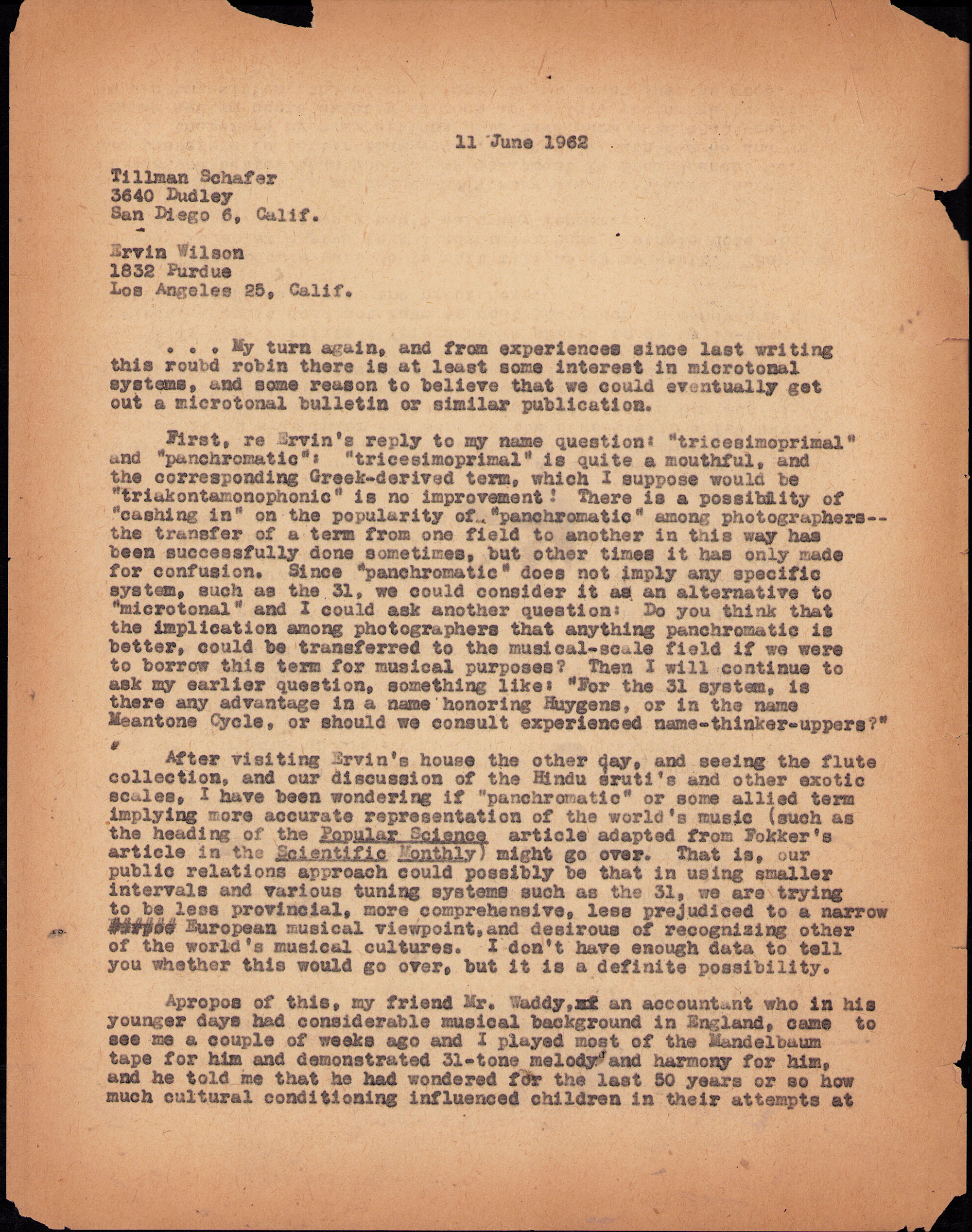 Letter from Ivor Darreg to Erv Wilson and Tillman Schafer. Ivor Darreg, 1962-06-11